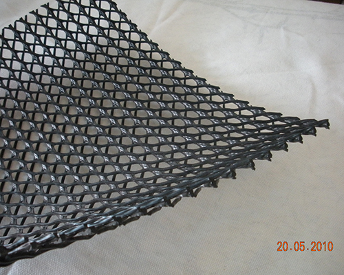 排水網(wǎng)以高密度聚乙烯為原材料,通過特殊的機(jī)頭擠出肋條,三根筋條按一定間距和角度排列形成有排水導(dǎo)槽的空間結(jié)構(gòu)。三層筋條間形成的排水導(dǎo)槽在較高荷載下不易變形,能夠防止土工織物嵌入土工網(wǎng)芯,確保排水暢通。