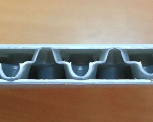 蜂窩狀芯材是用PC(聚碳酸酯)、PP(聚丙烯)等,經(jīng)加工粘合成六角形、圓形空腹(蜂窩狀)的整塊芯材。常用的面板為PC、PMMA、PETG等。面板必須采用合適的膠粘劑與芯材牢固地粘合在一起,才能顯示出蜂窩板的優(yōu)異特性,即具有比強度大、導(dǎo)熱性低和抗震性好等多種功能。
